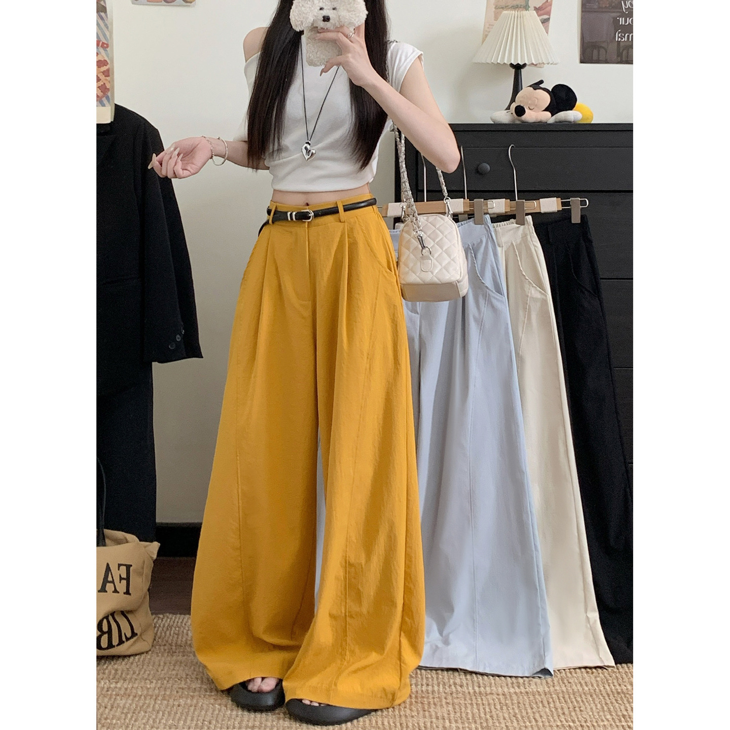 韩系设计感褶皱直筒裤2025夏季新款阔腿裤高腰宽松九分裤休闲 ??