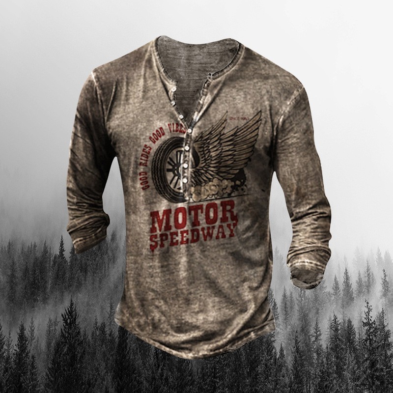 2024春季欧美新款长袖复古3D印花上衣男式T恤七粒扣亨利衫