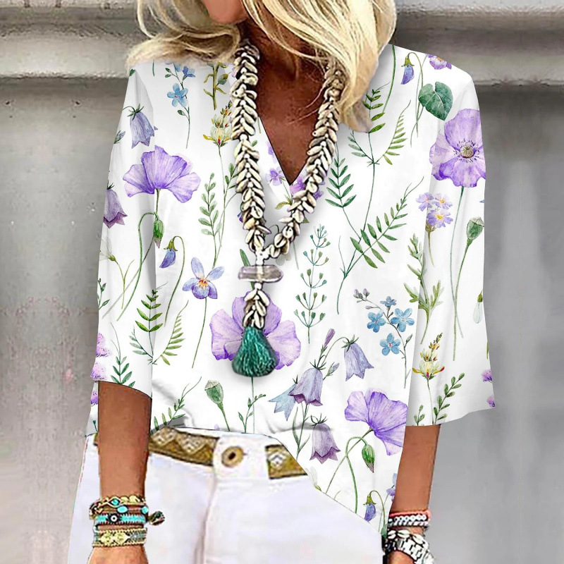 春夏新款亚马逊独立站跨境时尚女装花卉印花休闲V领七分袖上衣T恤