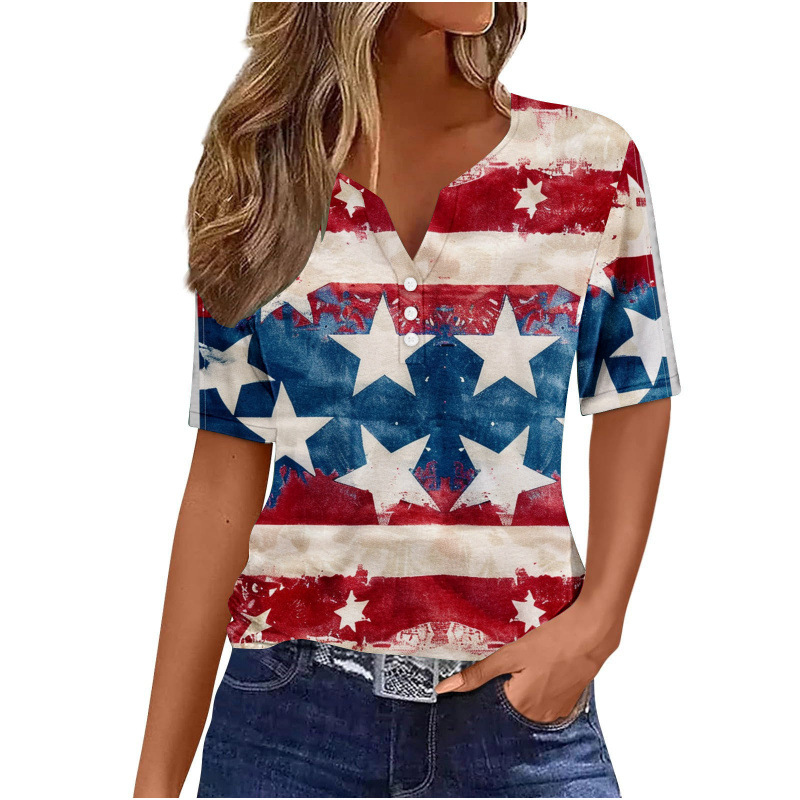 亚马逊独立日T恤休闲跨境欧美女装三扣V领短袖条纹印花上衣亨利衫