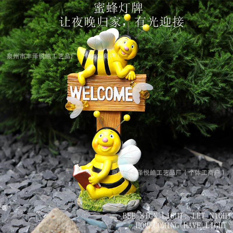 跨境太阳能小蜜蜂欢迎牌树脂摆件户外花园阳台别墅创意场景工艺品