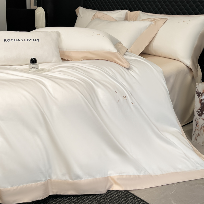 水星家纺100支长绒棉四件套纯色全棉拼角被罩全棉被套a类轻奢床单