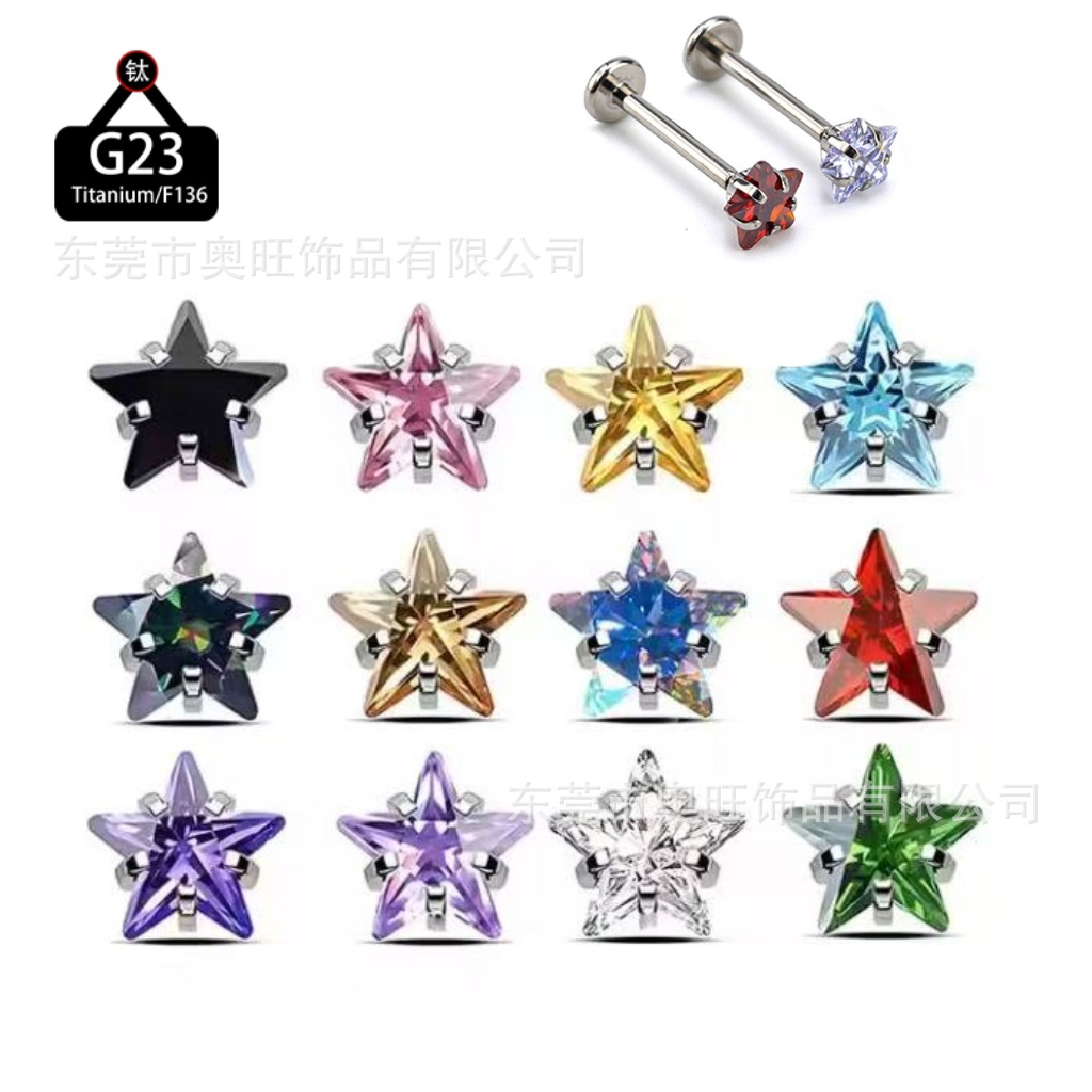 F136钛星星5A锆石耳钉五角星爪锆耳骨钉G23钛合金穿刺耳饰品配件