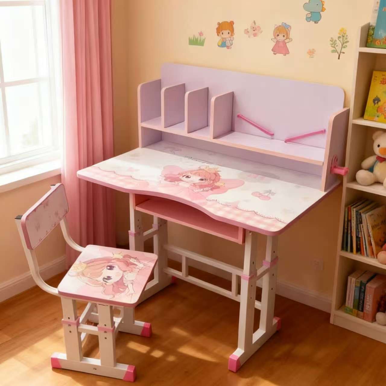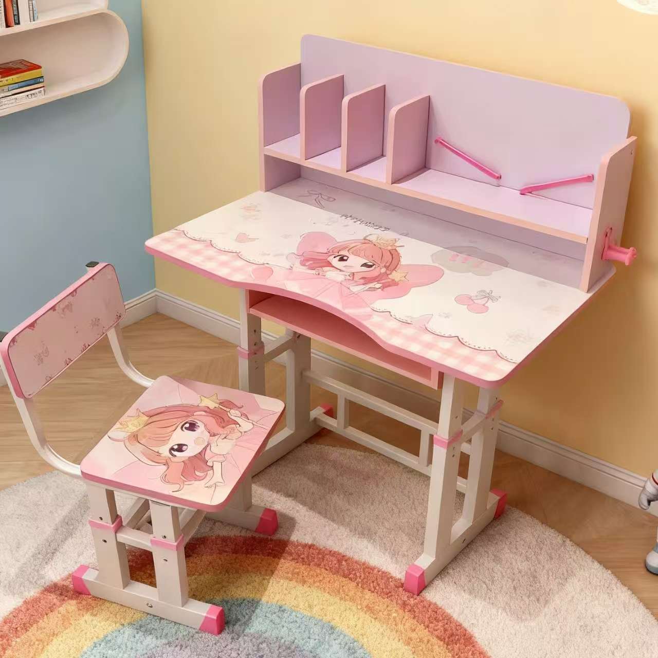 粉色儿童书桌组合可升降课桌椅书架一体桌小学生家用学习桌课桌椅