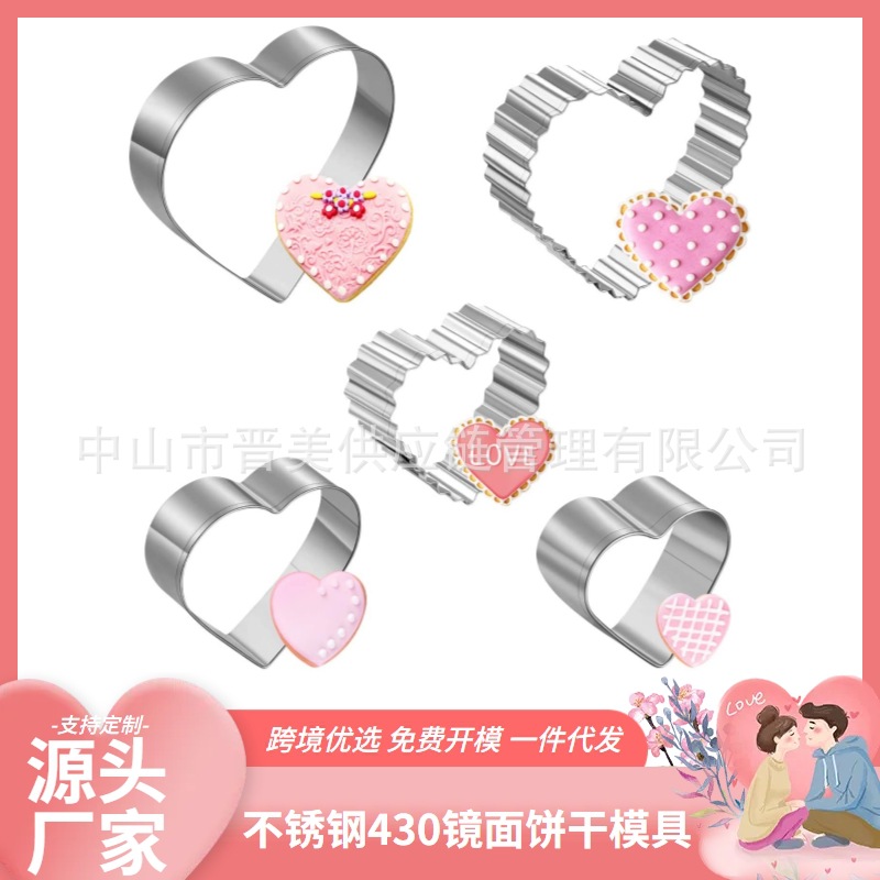 5件心形套装不锈钢饼干模具情人节系列糖霜按压式烘焙工具diy跨境