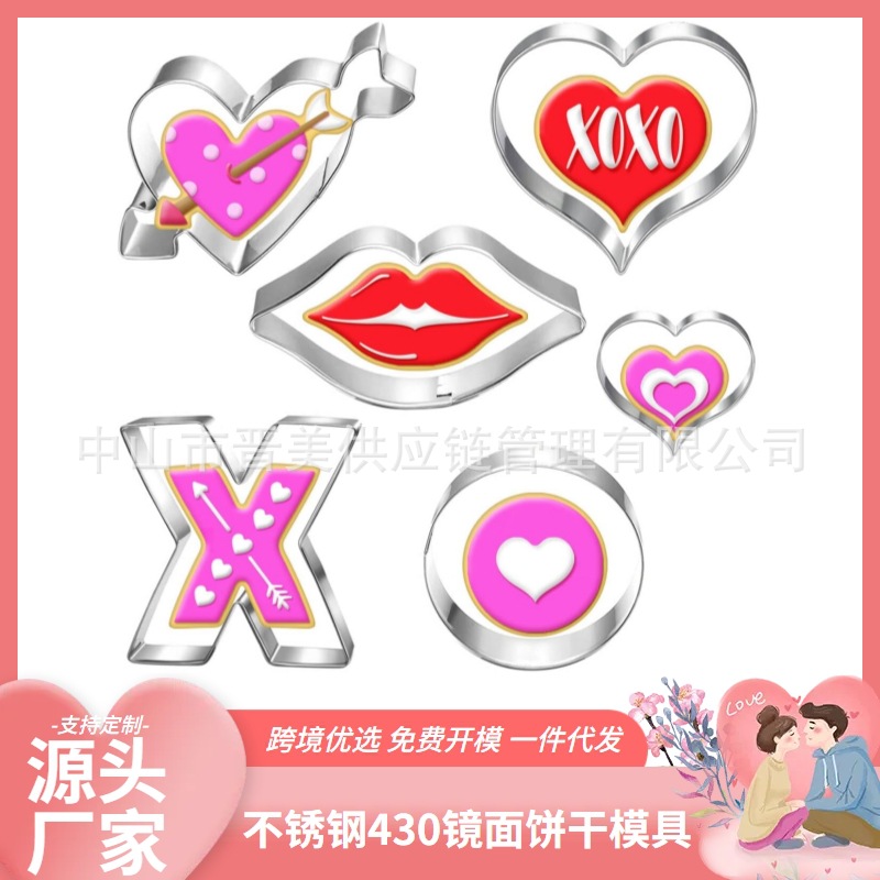 6件情人节套装不锈钢饼干模具XO嘴唇糖霜按压式烘焙工具diy跨境