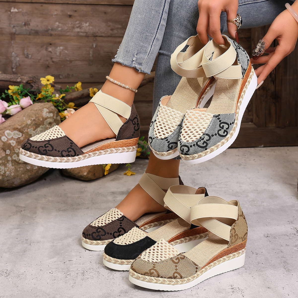 跨境亚马逊时尚女凉鞋 新款包头坡跟凉鞋 厚底防水台草编麻绳凉鞋