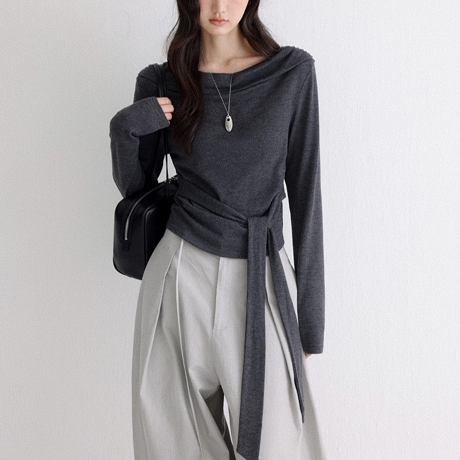 CHACHASTU复古灰色绑带收腰长袖上衣女气质极简小个子显瘦套头T恤