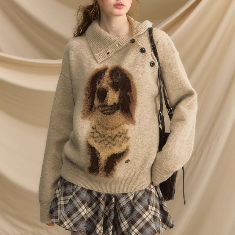 LOLOL早安小腊肠套头毛衣女秋小狗复古宽松慵懒风外穿针织衫
