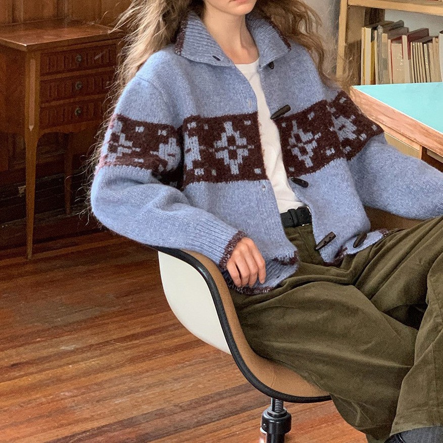 facade pattern提花针织开衫女秋冬新款翻领撞色宽松拉链上衣外套