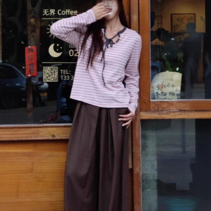 粉色条纹圆领T恤女2025秋气质宽松休闲显瘦长袖内搭上衣