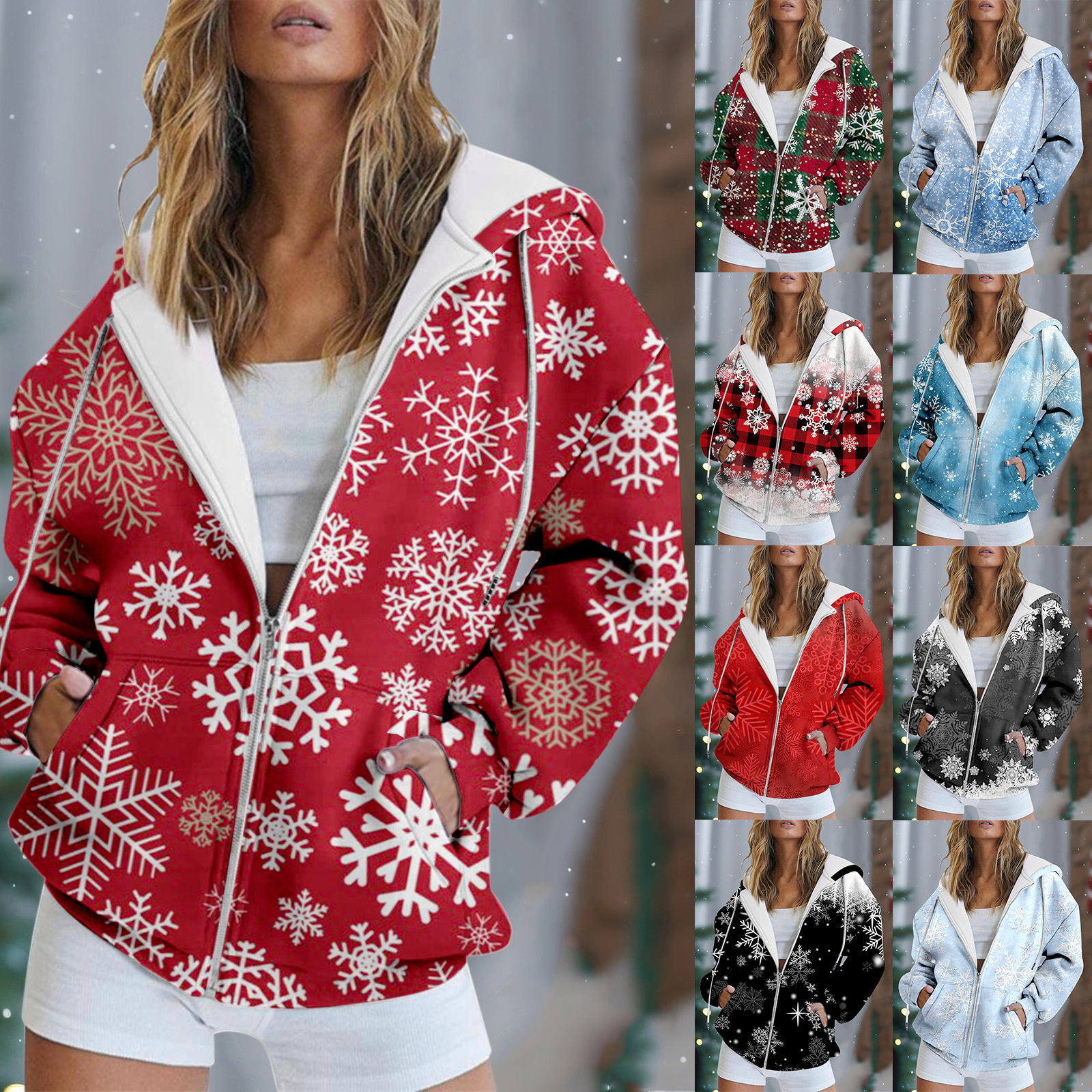 新款亚马逊eBay欧美女士卫衣带帽拉链圣诞印花休闲运动卫衣外套女