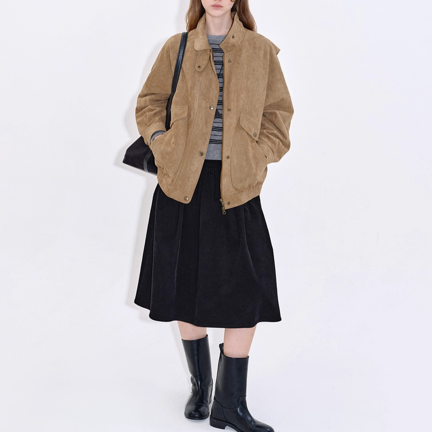 小众复古柔雾感卡其色麂皮绒弧形口袋皮衣外套女小个子