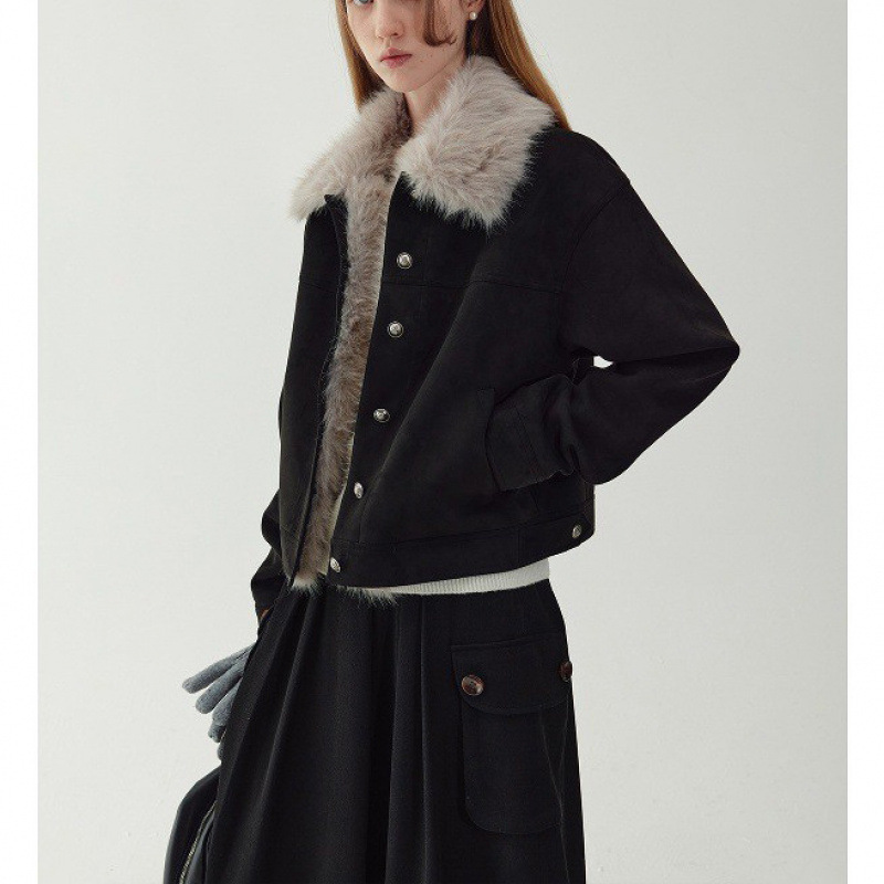 范洛Fano复古休闲麂皮短外套2025秋冬设计可拆卸毛领棉服夹克女
