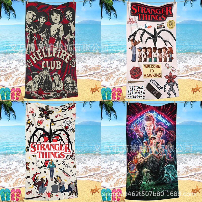 跨境TEMU爆款美剧速干吸水浴巾超细纤维卡通怪奇物语主题沙滩巾