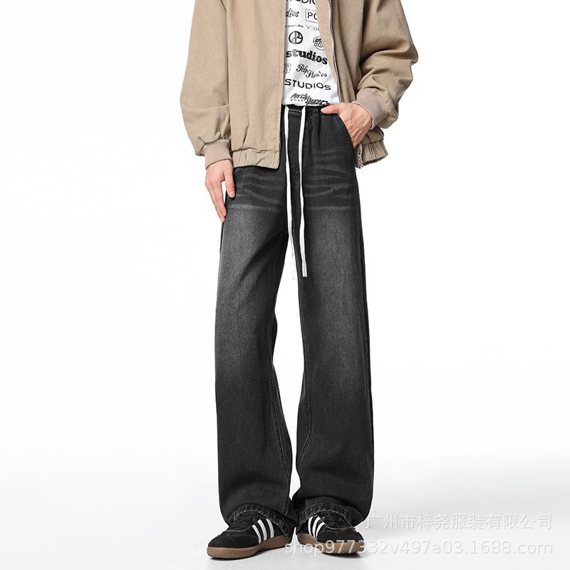 高街潮牌黑色渐变水洗牛仔裤男宽松直筒裤抽绳设计垂感拖地橡筋裤