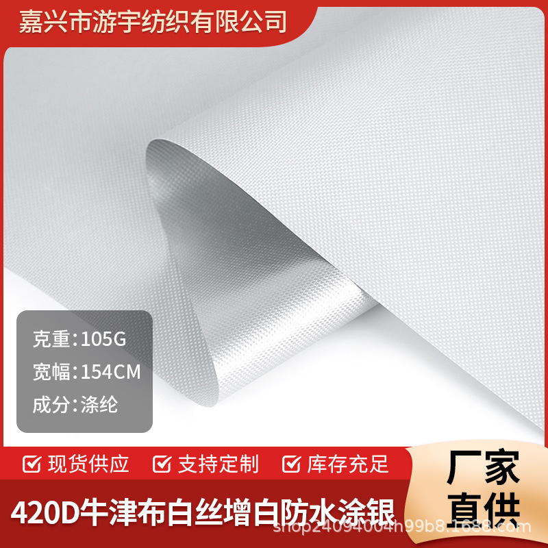 厂家白色现货420D牛津布白丝增白防水涂银帐篷布遮阳布箱包布面料