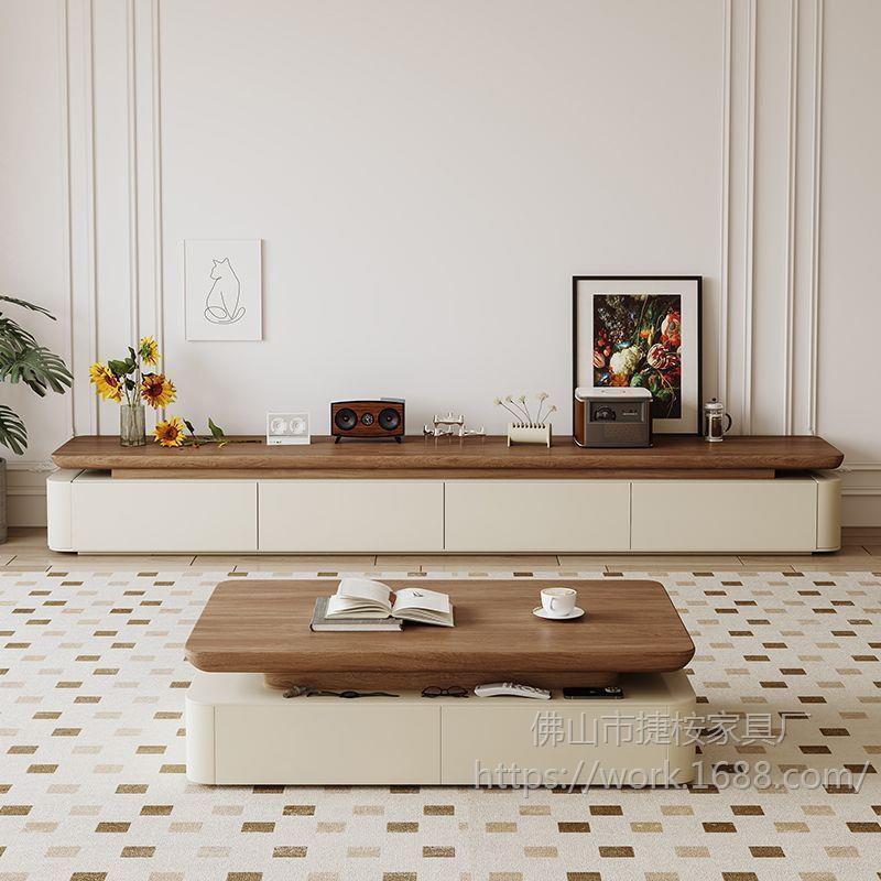 奶油风实木岩板茶几客厅家用原木色拉伸电视柜组合大小户型落地柜