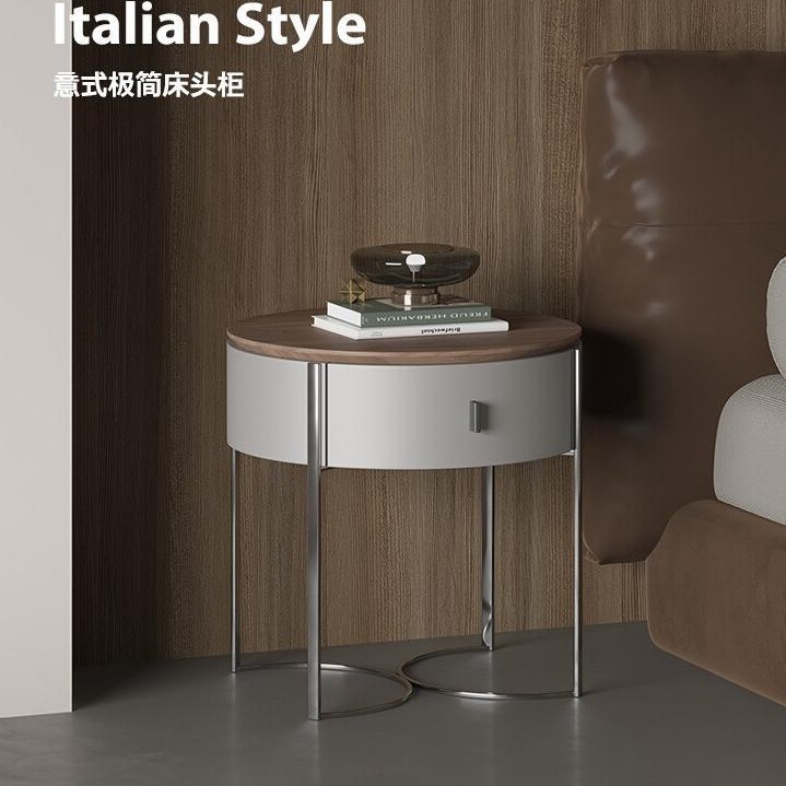 极简圆形实木现代简约胡桃木床头柜烤漆不锈钢高脚储物柜北欧柜子