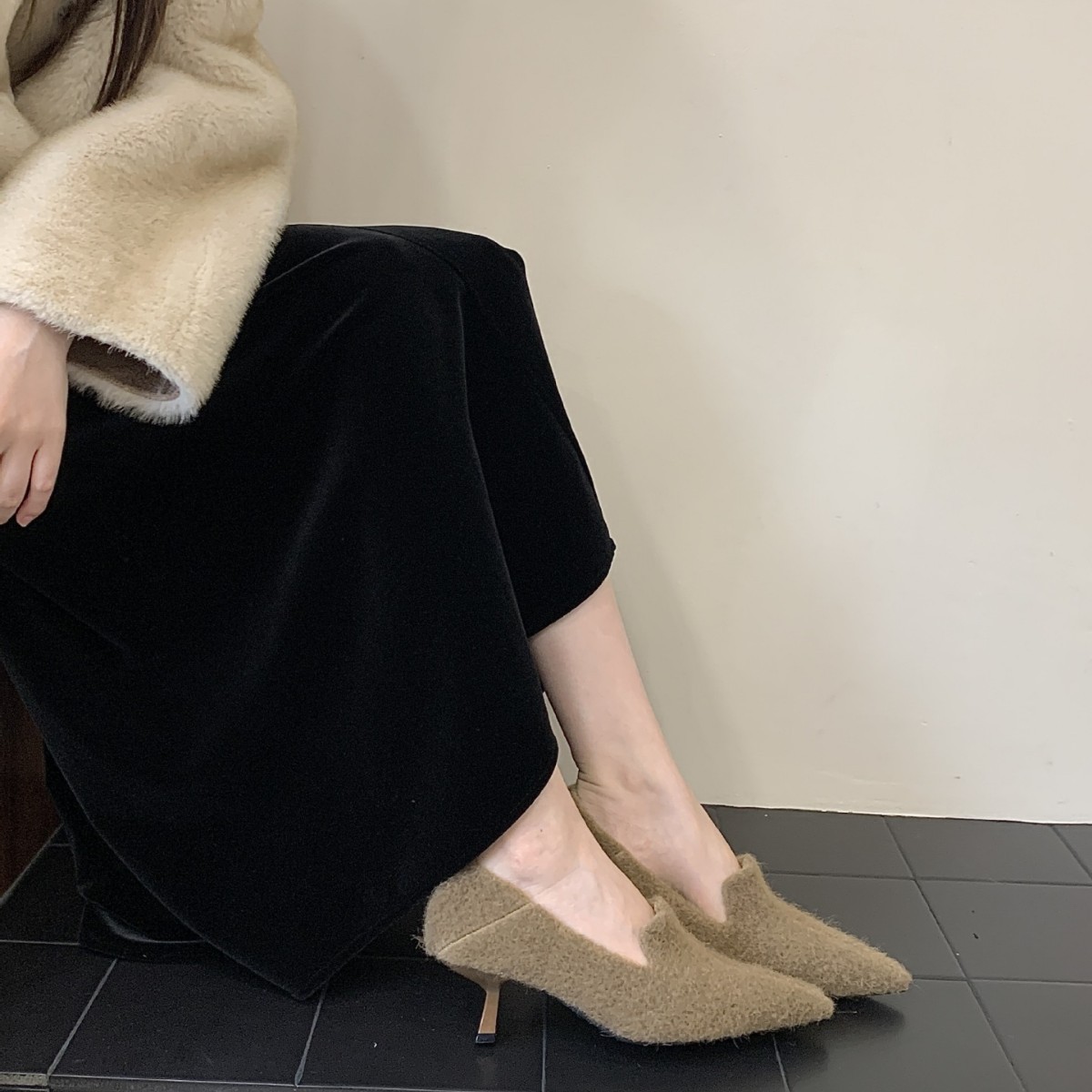 法式尖头毛毛鞋2025冬季新款一字带扣加绒保暖高跟潮流时尚女单鞋