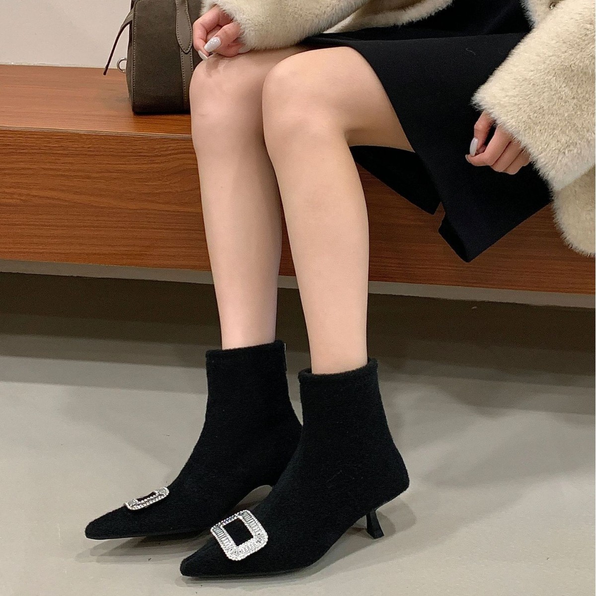 轻奢时尚女短靴2025冬季新款尖头水钻扣后拉链绒面低筒瘦瘦马丁靴