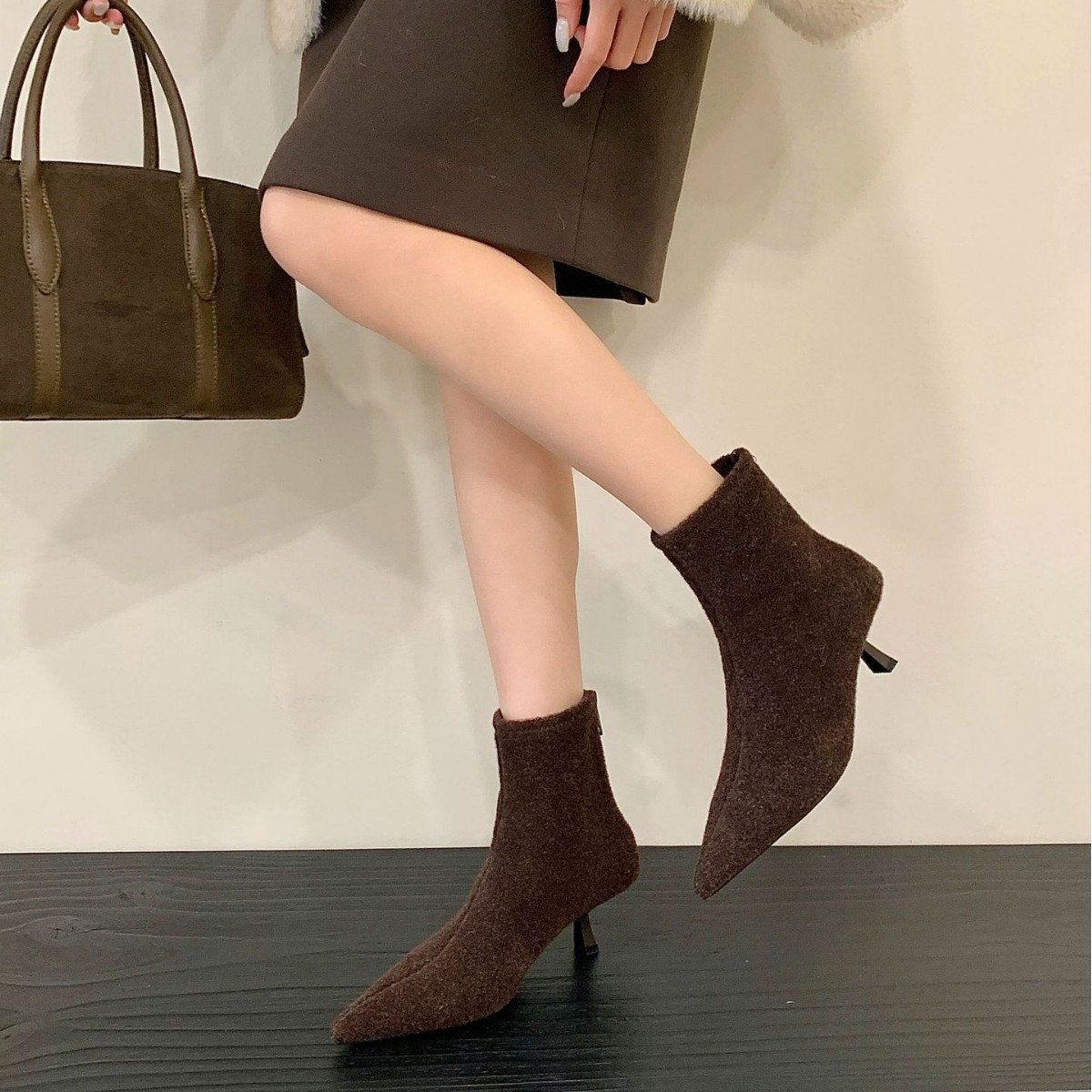 欧美新款2025冬高跟后拉链瘦瘦靴绒面简约风尖头气质复古加绒短靴