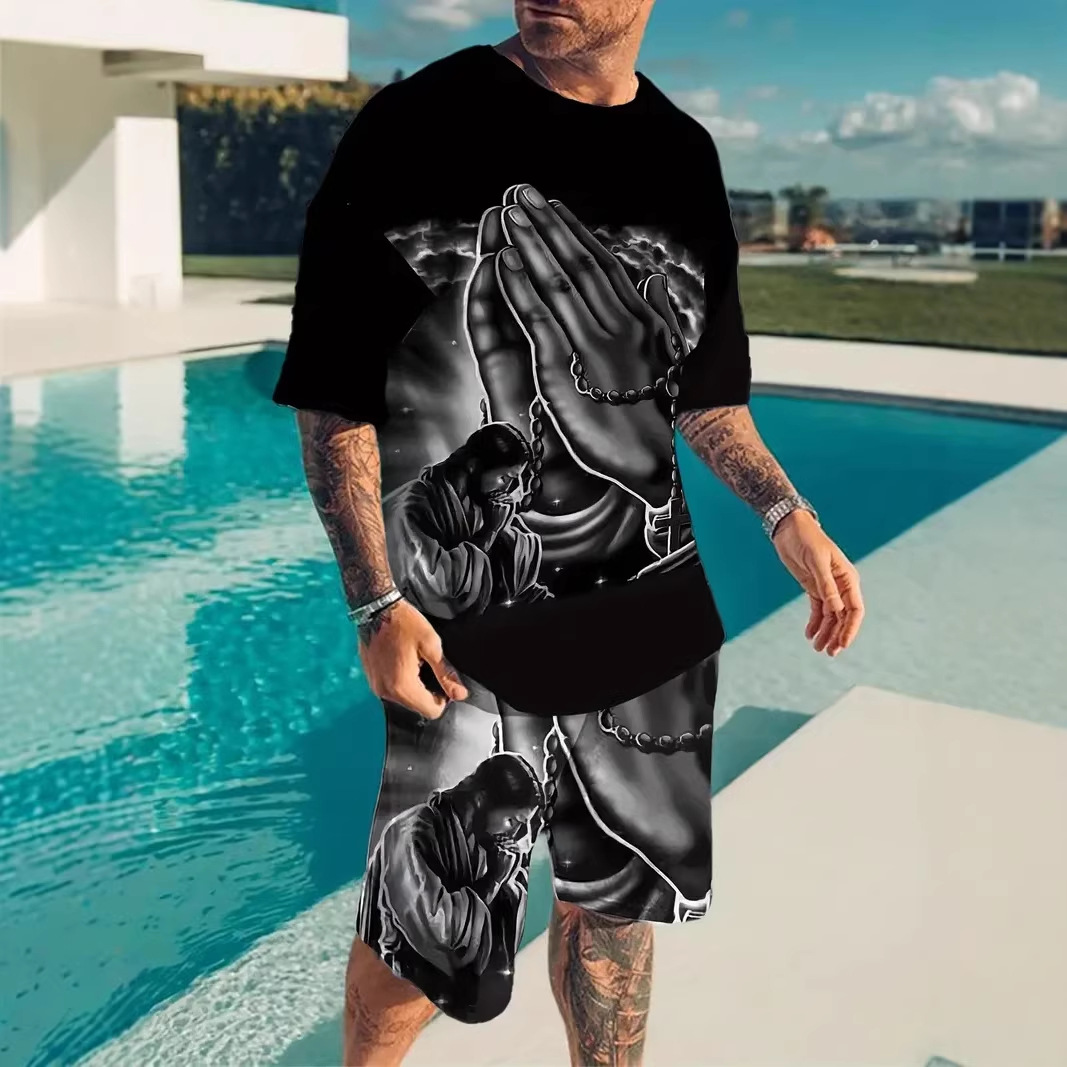2025年跨境欧美亚马逊夏季新款男士沙滩休闲运动圆领短袖短裤套装