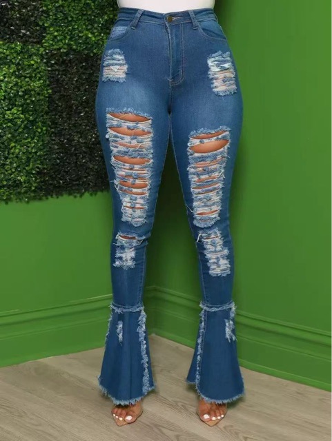 欧美跨境秋冬新款女士破洞弹力拼接复古牛仔裤喇叭裤 women jeans