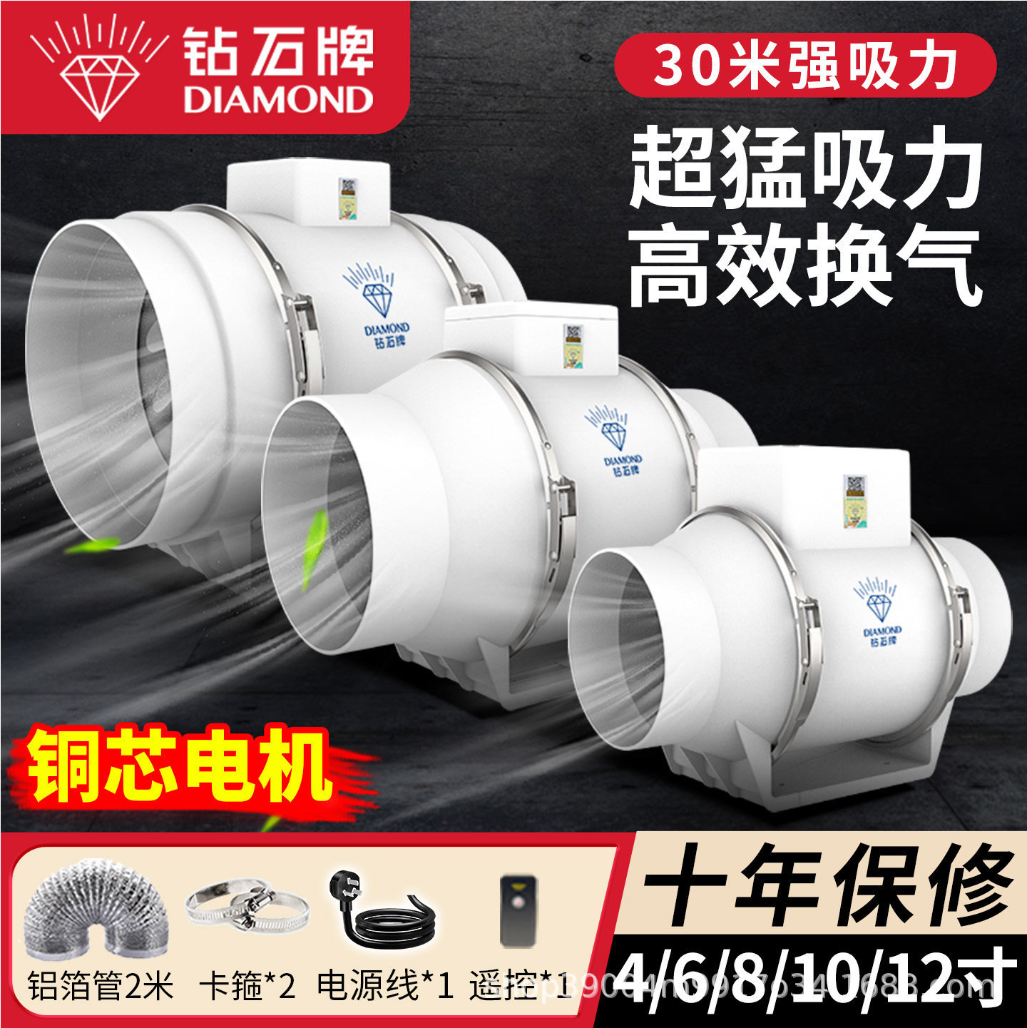 钻石牌管道风机通用大功率卫生间家用排烟斜流排气扇商用工业
