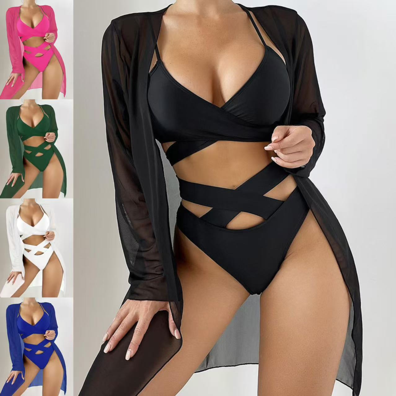 亚马逊新款欧美网纱性感罩衫比基尼三件套泳衣女高级感沙滩游泳装