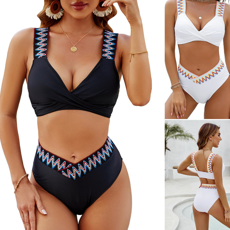 2026亚马逊分体泳衣高腰印花金属装饰比基尼套装跨境性感抹胸泳装