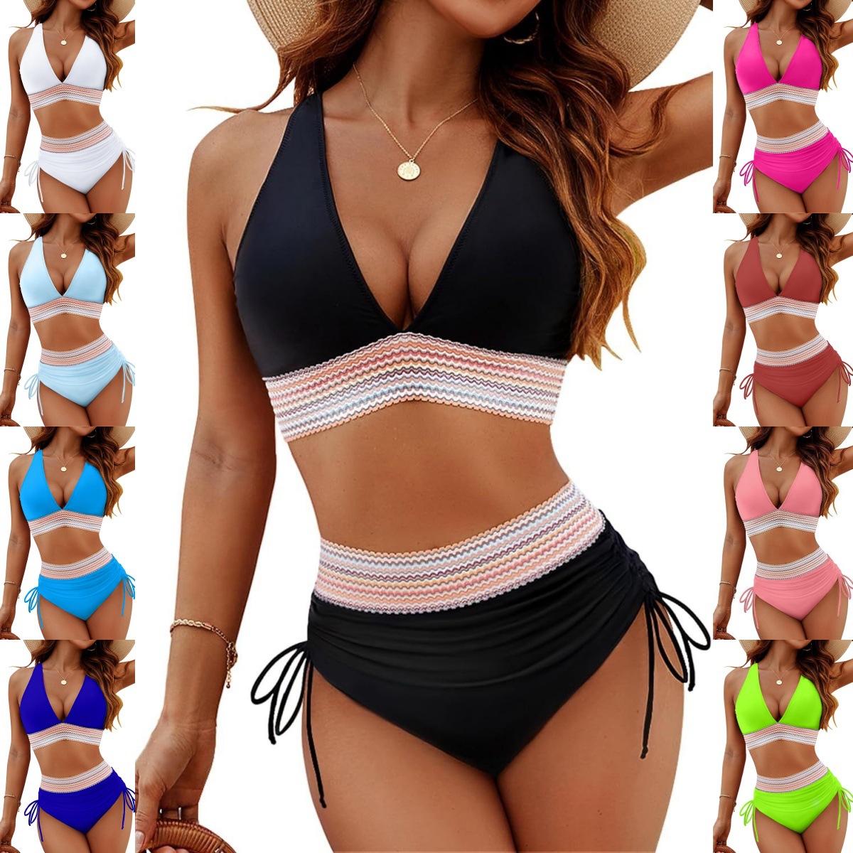 2026聚拢亚马逊性感泳衣女高腰绑带比基尼分体套装V领系绳比基尼