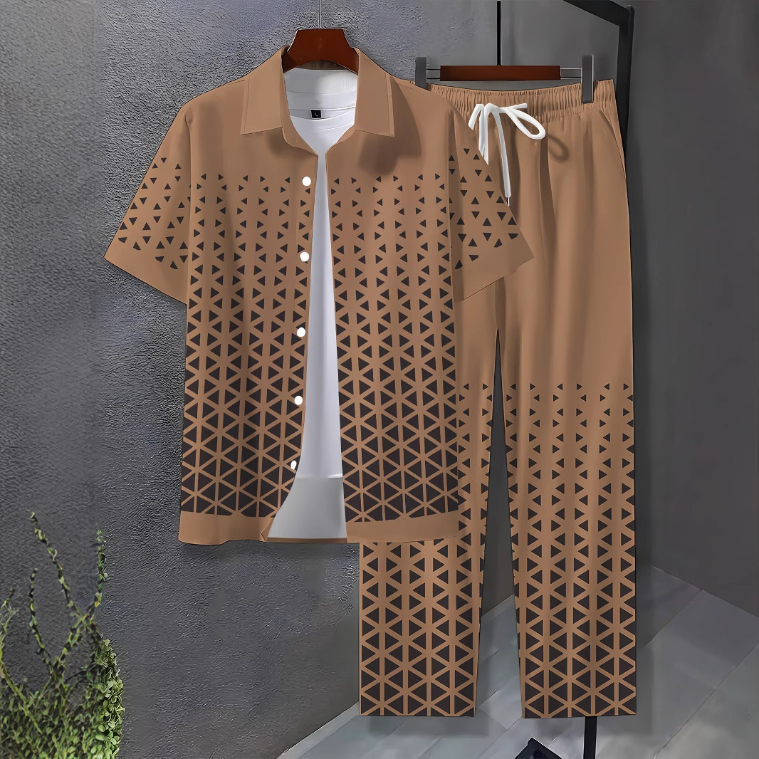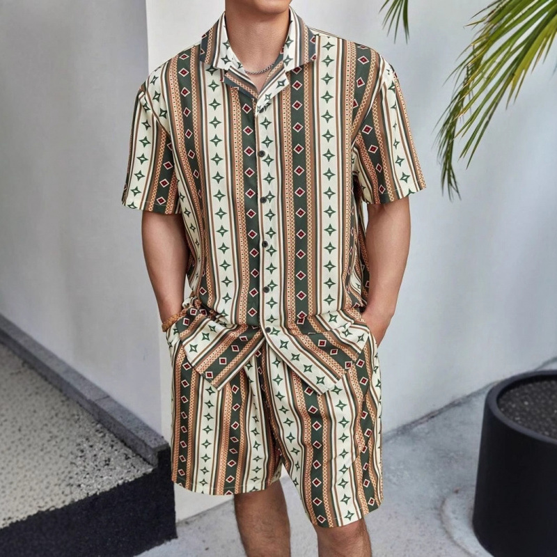 休闲户外条纹男士夏季潮流百搭高质量衬衫印花短袖长裤两件套
