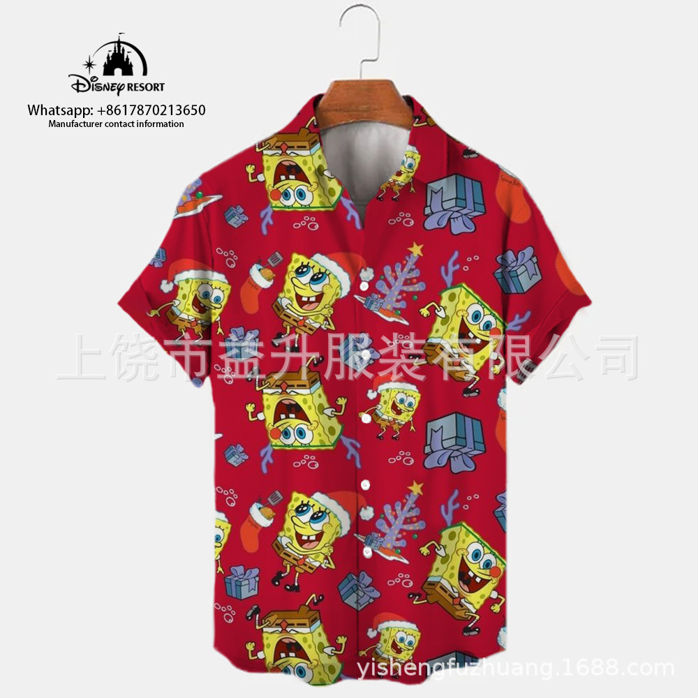 时尚海绵宝宝动漫主题休闲男士衬衫 夏季户外舒适个性潮流衬衫