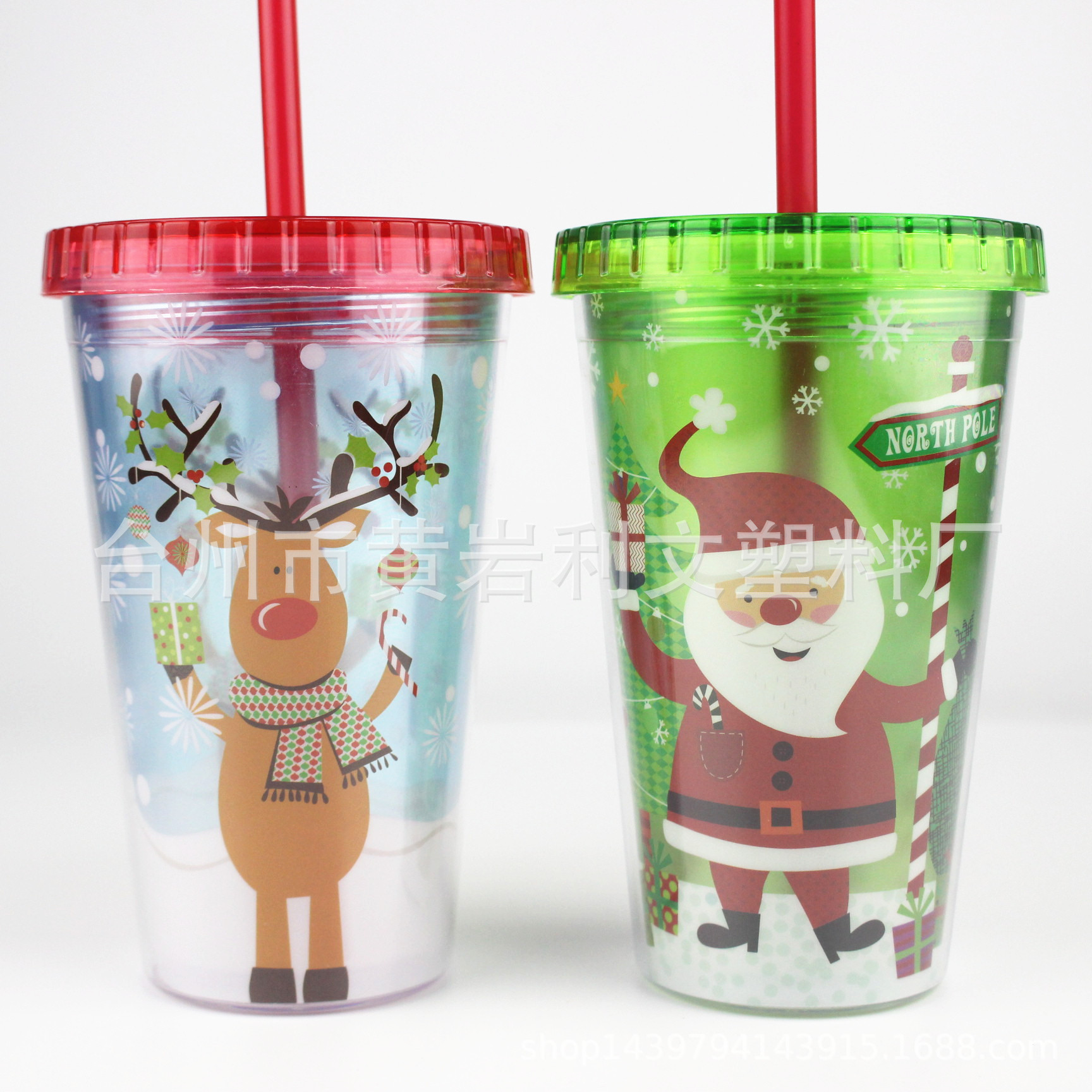 450ML圣诞盖吸管杯 16OZ双层塑料杯 PS杯 圣诞节节日礼品杯