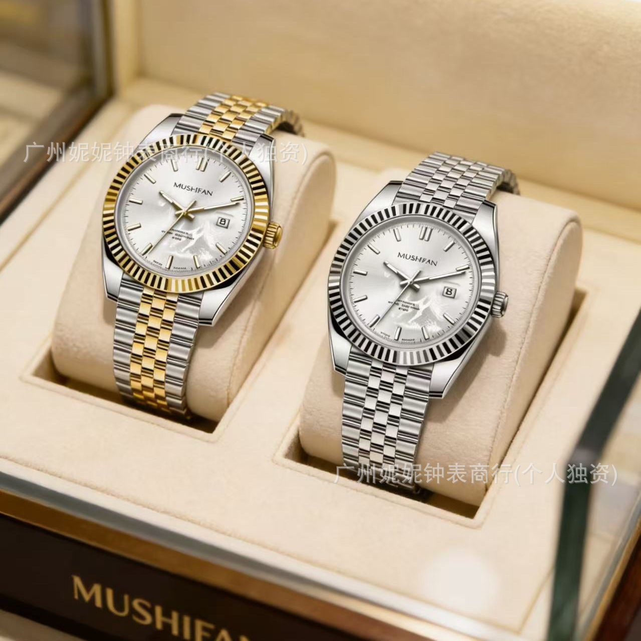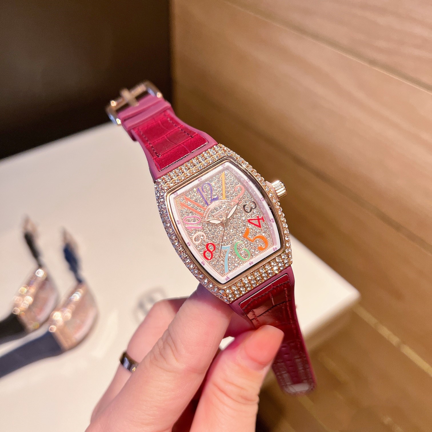 跨境男女F家M石英手表时尚百搭三针镶钻桶型夜光皮带手表批发速卖