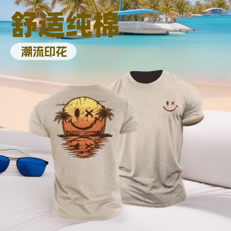 厂家促销日本动漫无袖长袖复古潮牌笑脸落日椰树印花纯棉短袖t