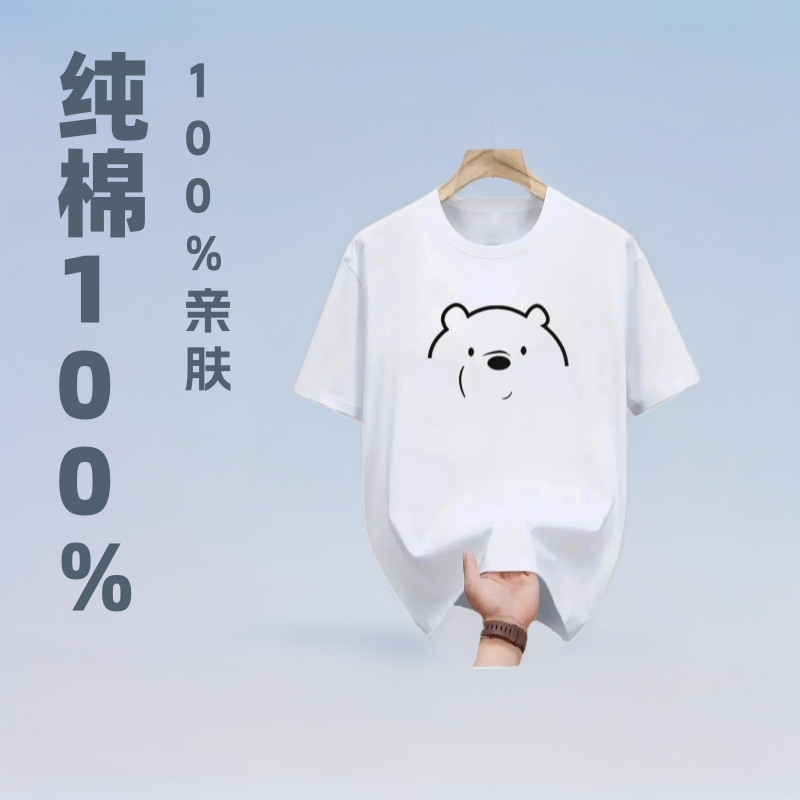2025男士 100%纯棉小熊印花休闲 T 恤,圆领短袖上衣