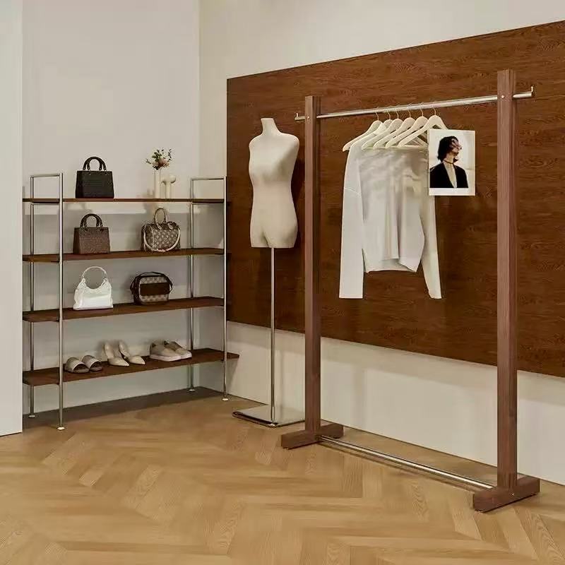 服装店展示架胡桃木色不锈钢落地挂衣架直播间陈列架中古风女装店
