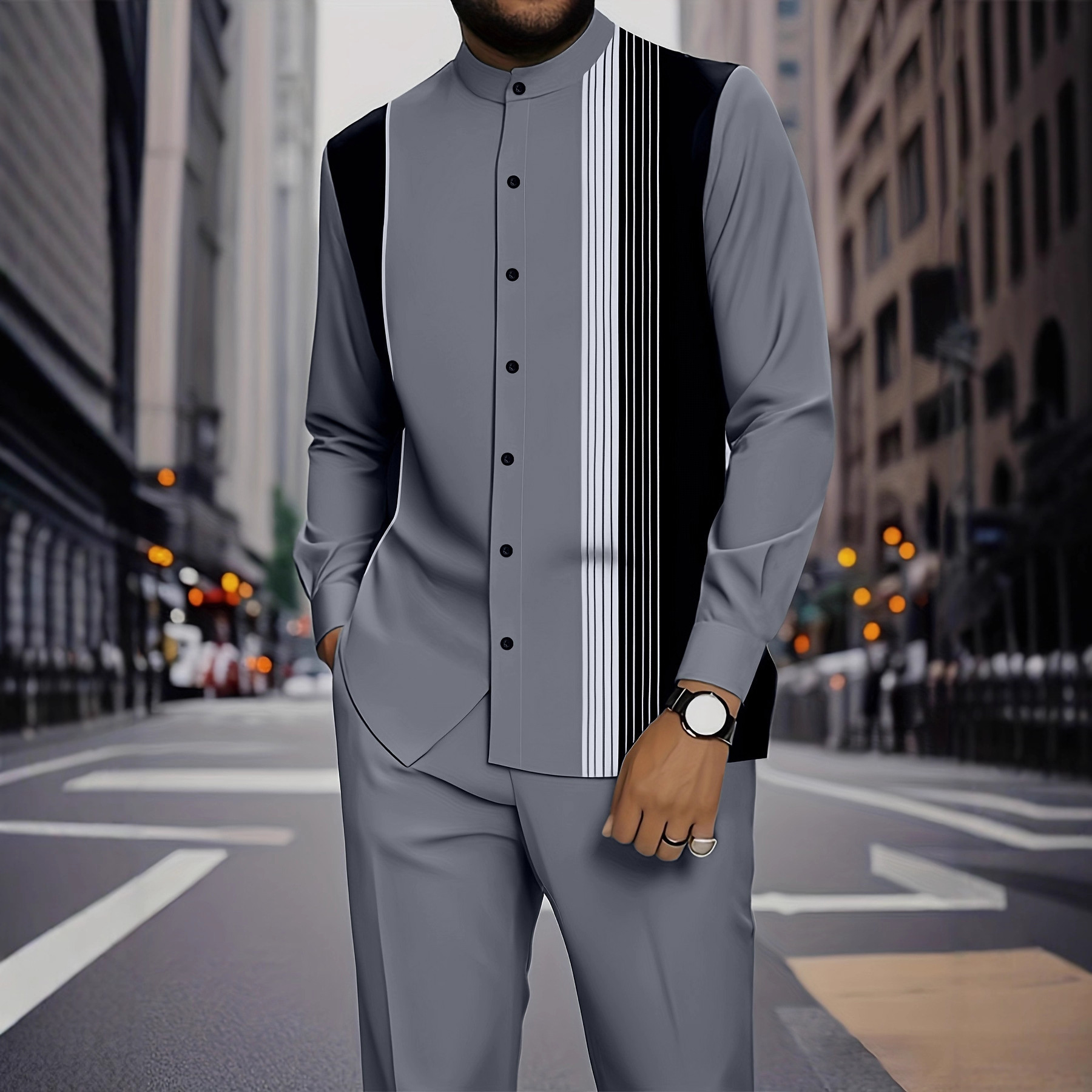 跨境欧美现货男士3d数码印花秋冬潮流条纹户外悠闲衬衫黑纽扣套装