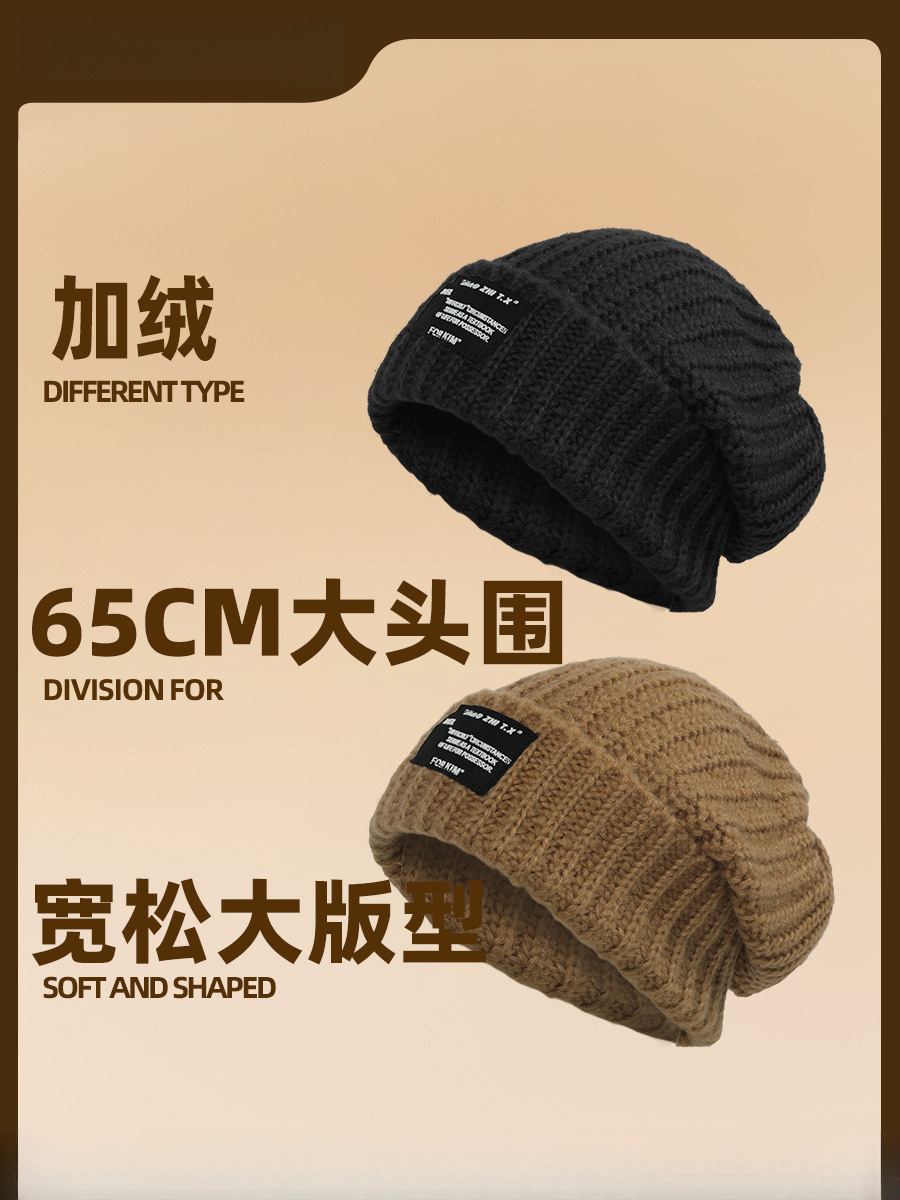 65CM大头围毛线帽男冬季黑色加绒毛线帽大码针织帽粗针织冷帽子女