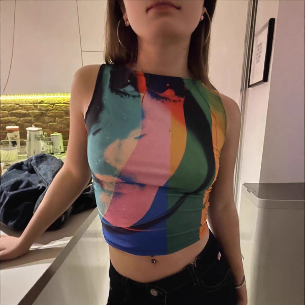 2025夏圆领无袖露脐修身显胸网纱小背心个性渐变人像印花短款上衣