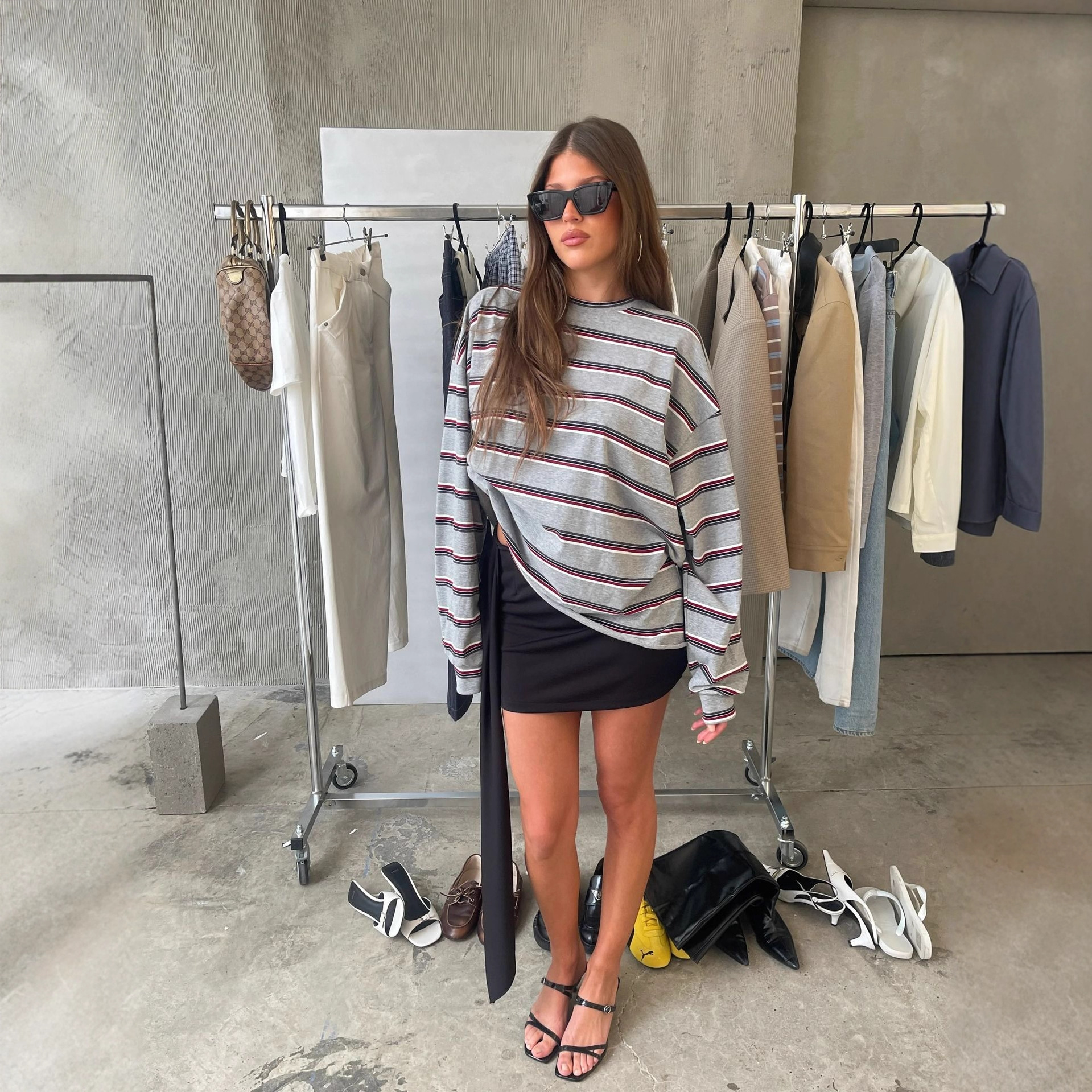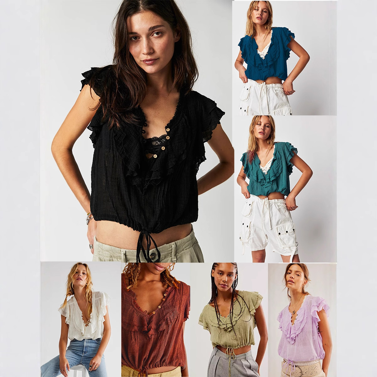 2025新款女欧美INS 打条荷叶边休闲衫 V领抽绳收腰打底衫女