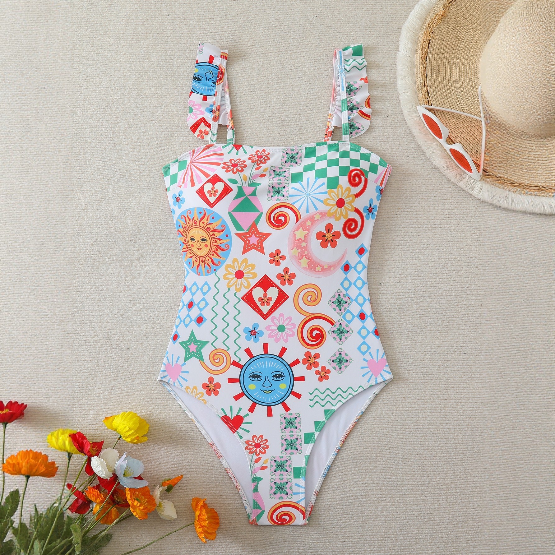 2026新款花边搞怪印花可调节肩带修身女连体泳衣海边度假温泉泳装