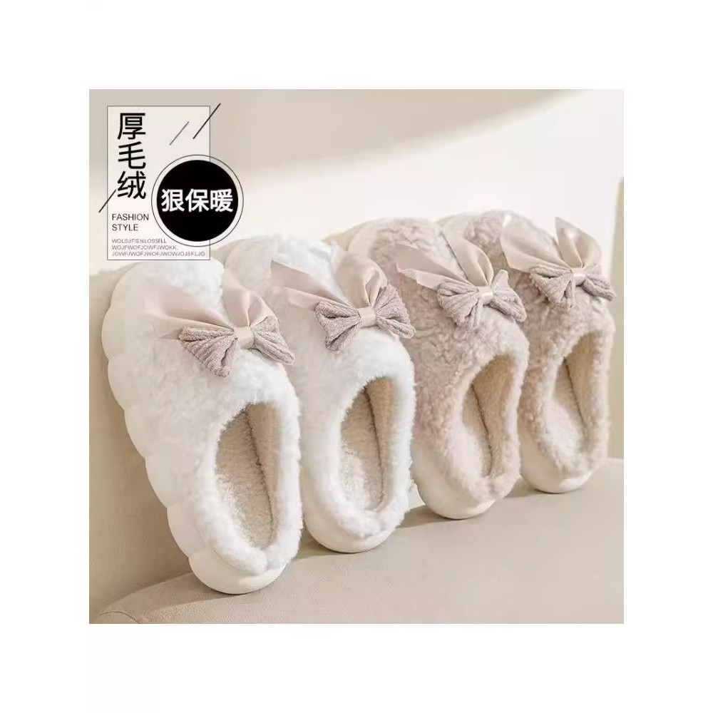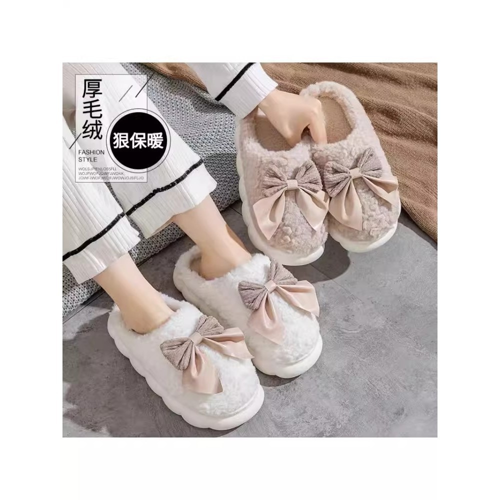 冬季蝴蝶结羊羔毛棉拖鞋少女款软萌加绒保暖鞋厚底防滑居家棉拖鞋