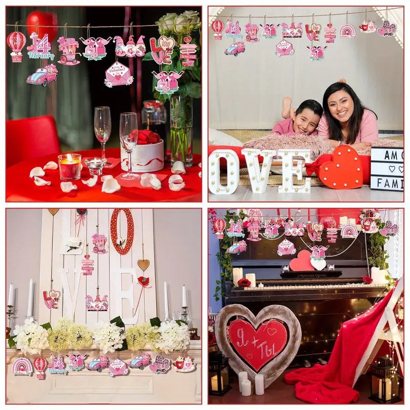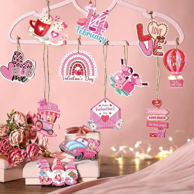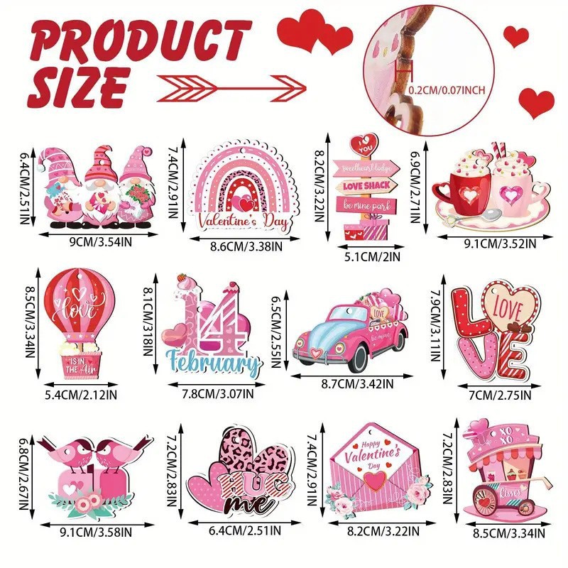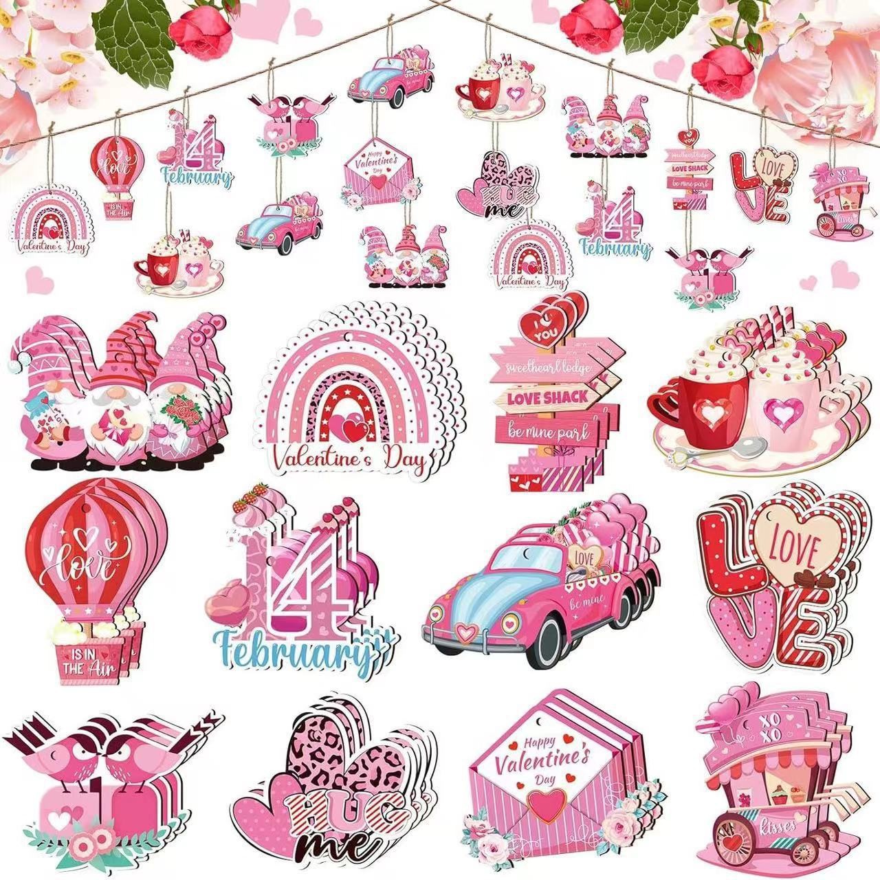 36件情人节木制装饰粉红色饰品心形小矮人卡车装饰挂饰派对礼物