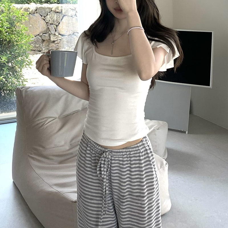 氧气因子纯欲小飞袖方领纯色短袖T恤女夏季设计感修身显瘦短上衣