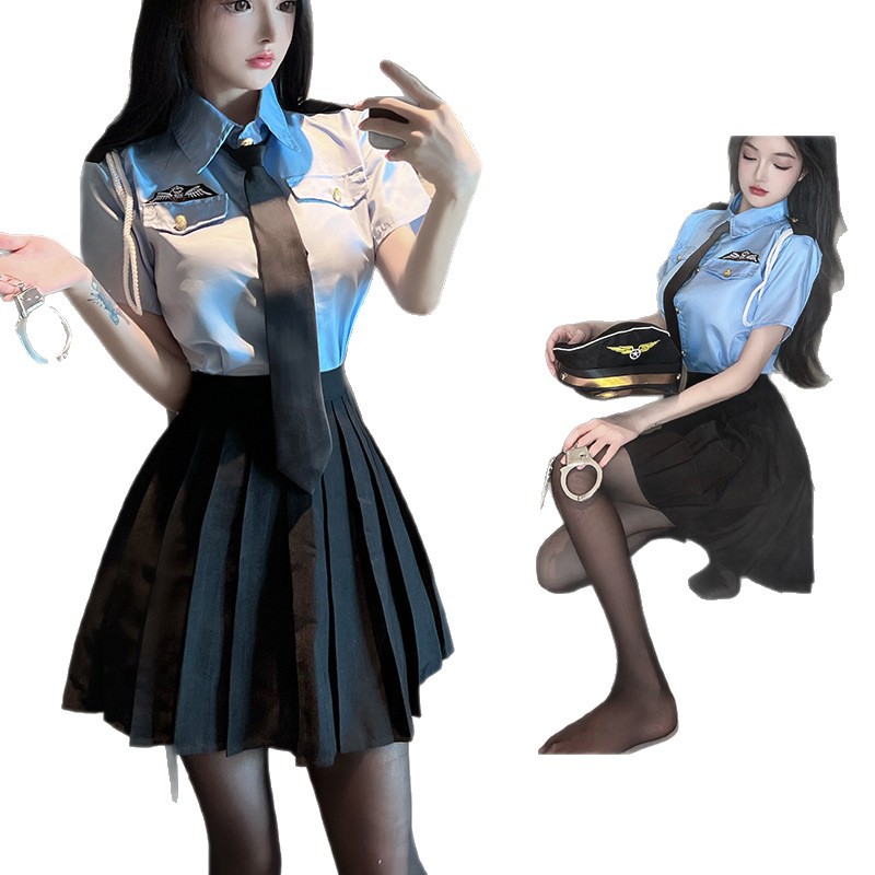 情趣内衣蓝色女警察制服诱惑百褶短裙激情性感秘书角色套装