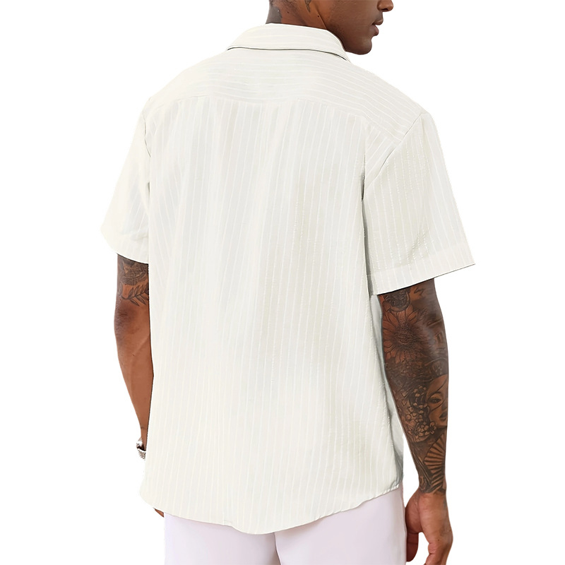 现货新款男士简约条纹衬衫短袖休闲宽松透气男士开衫翻领上衣