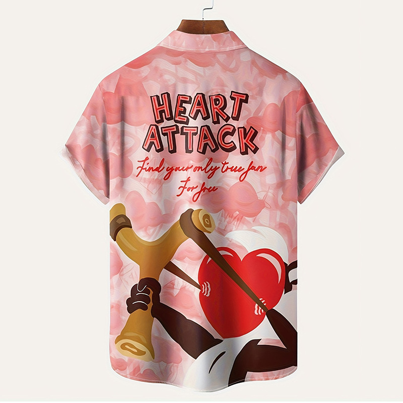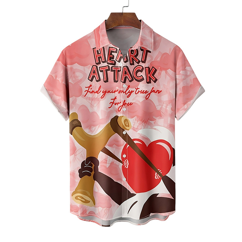 现货2025新款男士情人节3D数码印花爱心情侣短袖衬衫休闲上衣